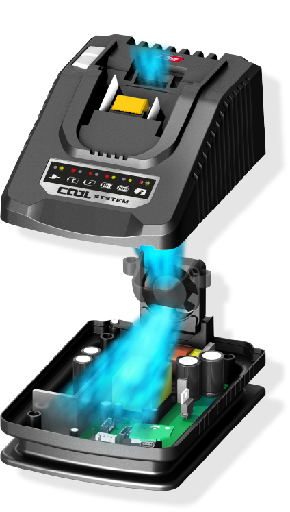 Интеллектуальная система для быстрой зарядки. Вентилятор на каждый порт и вентиляционные каналы в АКБ к каждому элементу для предотвращения перегрева АКБ и ЗУ при зарядке. Контроль температуры при использовании и зарядке в целях защиты и увеличения ресурса АКБ.